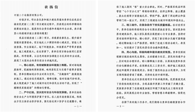 中国二十冶邻水县旧城有机更新项目收到表扬信