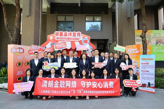 为迎接2026年“3·15”金融消费者权益保护宣传日,人保寿险广东省分公司近日在全省范围内启动以“清朗金融网络 守护安心消费”为主题