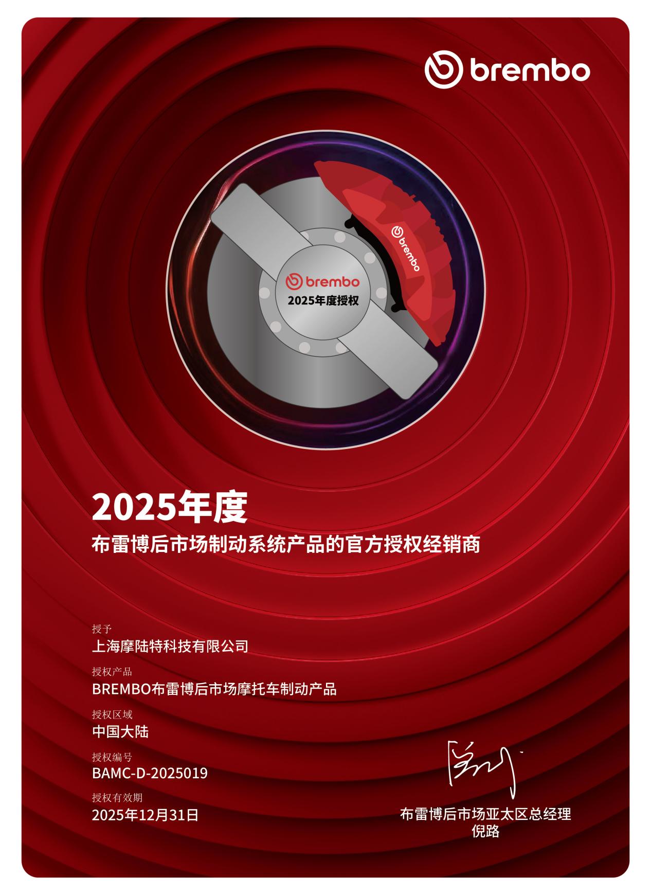 近日,在摩托车零部件行业引发广泛关注的一则消息传来,上海摩陆特科技有限公司(以下简称摩陆特)成为布雷博中国摩托车后市场产品的一