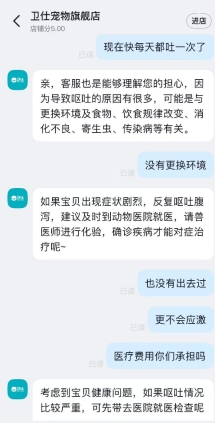 她联系卫仕客服后,对方仅表示“造成宠物呕吐原因有很多”,建议就医,但对是否承担医药检查费用回避不谈,并要求“退回全部商品(包括已开封部分)才可退款”。周丽认为商家态度是典型的"不担责、不承认、不售后"。