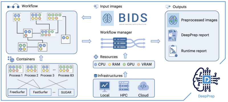 为应对当前挑战,昌平实验室刘河生课题组在利用深度学习优化脑影像数据处理的领域深耕多年,并将多年研究积累整合成了一条端到端的基于深度学习的神经影像预处理管线——DeepPrep。DeepPrep基于多项先进的深度学习算法,实现了对结构与功能MRI的神经影像精准预处理,在计算速度方面相较于传统工具实现了十倍以上的提升。