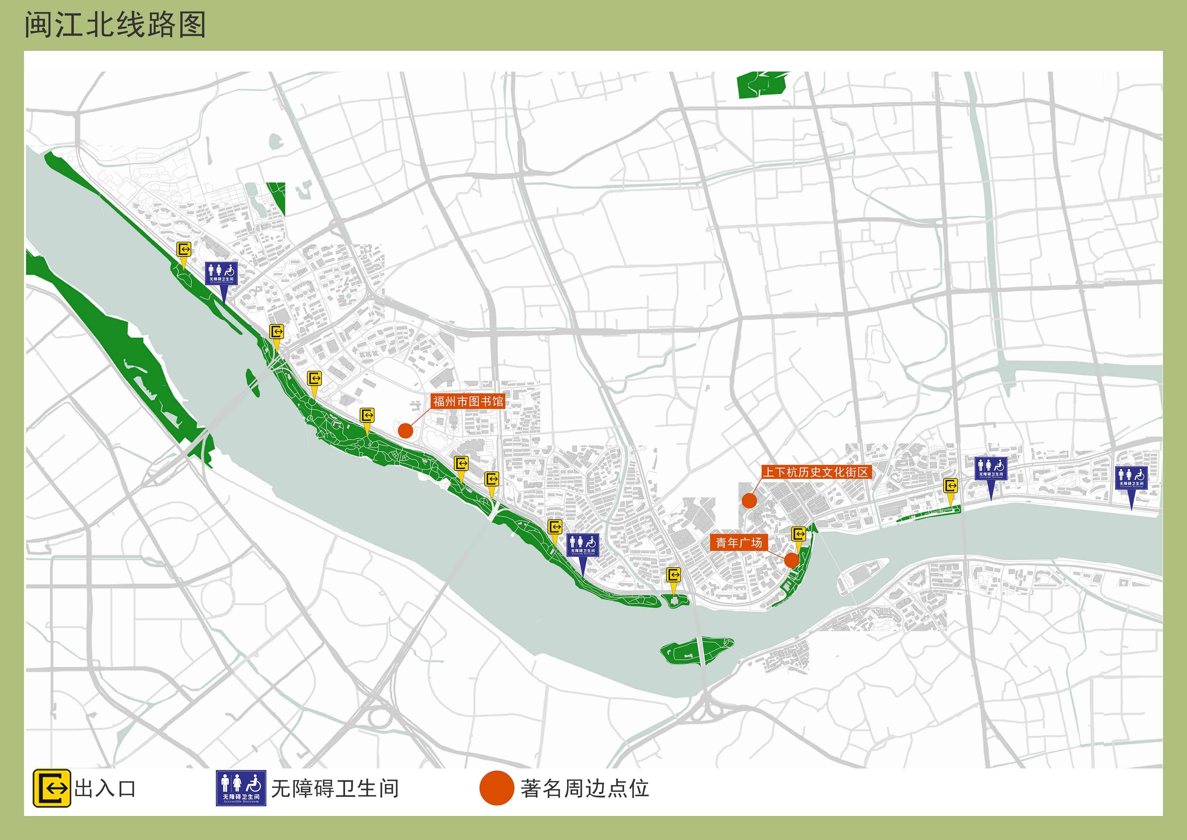 活动前期,实践队实地步行考察了闽江北岸绿道的无障碍设施建设现状,并逐一排查了绿道沿线的各个无障碍节点,与专业导师探讨,梳理形成一份适合老人、幼儿、残障人士等各类人群出行的无障碍地图,标明了相关的出入口、设施节点和适宜的出行规划路线。