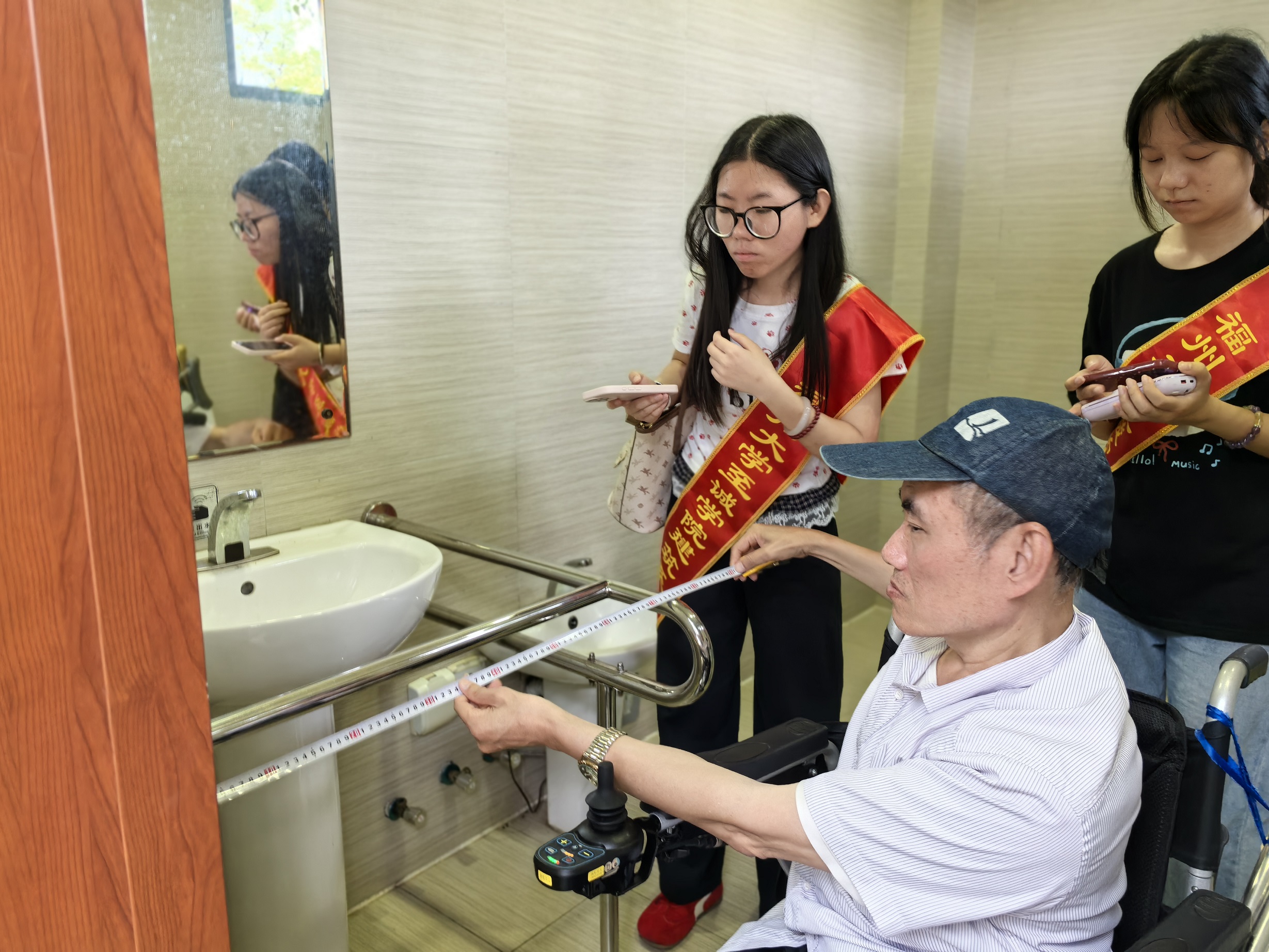 活动伊始,福建省肢残人协会根据实践队绘制的无障碍地图在闽江北岸绿道出行,并且与实践队成员们参照福建省无障碍设施建设图集,对绿道现有的无障碍设施进行多维度勘验。调研涵盖坡道是否符合1:12或1:20的坡度要求、卫生间安全抓手是否规范、以及标识系统是否明晰等规范问题,对不规范设施进行重点记录,并将问题反馈给相关部门,推动无障碍建设的可持续发展。