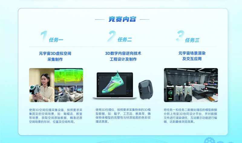 该赛项的竞赛内容在“工业4.0”的产业发展背景下,围绕当前元宇宙产业的热门应用方向,如数字化商城、虚拟展馆、AR试穿等应用场景开展,竞赛任务包括:元宇宙3D虚拟空间采集制作、3D数字内容逆向技术工程设计及制作、元宇宙场景渲染及交互应用,以及元宇宙3D数字内容设计创作商业应用理论知识等。通过竞赛,一方面学生能够深刻理解3D数字化技术在社会生产、经济发展中的作用;另一方面,各学校、社会组织、企业也能够以大赛为桥梁,共聚一堂,共同探讨产教融合、校企合作与产业发展。