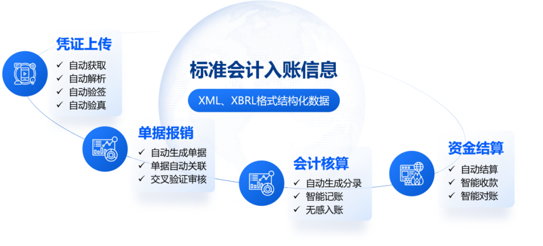 电子凭证会计数据标准为真正打通电子凭证全流程处理“最后一公里”扫除了障碍,企业获取电子凭证后即可直接进行数据处理和共享。浪潮海岳GSCloud支持包含XML、XBRL等结构化数据的电子凭证,无需转换即可直接进行接收、验签、验真、解析、报销、入账、归档等业务的自动化处理,大幅降低报销入账流程中的人工投入成本,提升智能化处理水平。