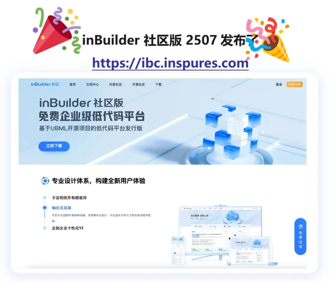 除此之外,社区发行版inBuilder Community 2507在会上全新发布,基于Farris Vue开源项目全面升级低代码开发技术栈,为开发者和用户打造更开放、更强大、更敏捷、更智能的开发体验。