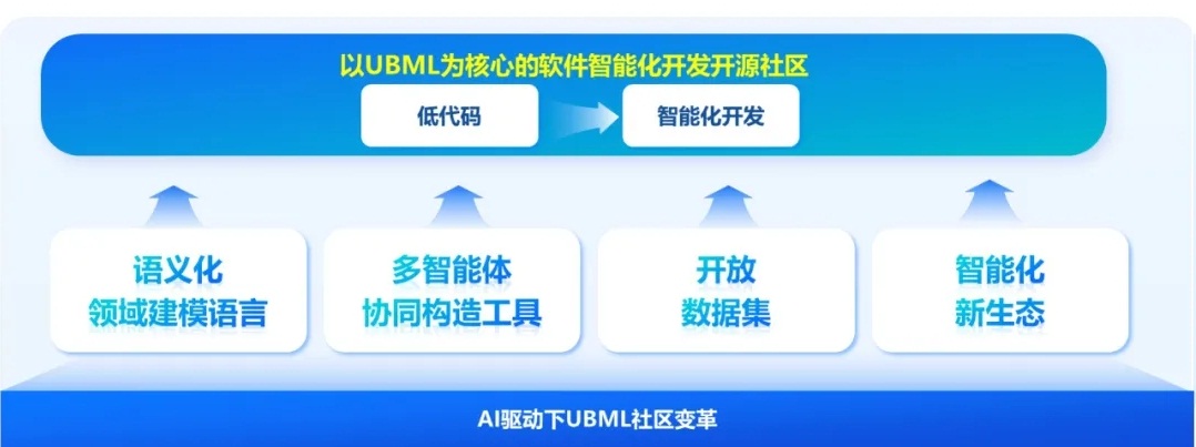 UBML开源项目创始人、PMC主席郑伟波在本次会议上正式宣布,UBML社区经过5年的发展,在AI驱动软件开发模式变革的关键时间节点上,UBML社区定位从低代码转向智能化开发,未来将聚焦语义化领域建模语言、多智能体协同构造工具、开放数据集、智能化新生态四大发展方向,全力构建以UBML为核心的软件智能化开发开源社区,为开发者和用户创造更大价值。