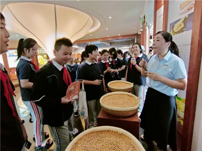 在豆文化展厅,时间的长河被缓缓展开。从淮南王刘安偶然点化的传奇起始,到豆腐承载的“清白方正”两千年文化品格,豆子的历史画卷清晰铺陈。最吸引人的是辨别转基因与非转基因大豆的环节——工作人员拿出两种豆子,让学生们观察外形、色泽差异,并讲解科学甄别的关键。一堂生动的食品安全启蒙课,将“入口之物,责任于心”的种子悄然埋下。