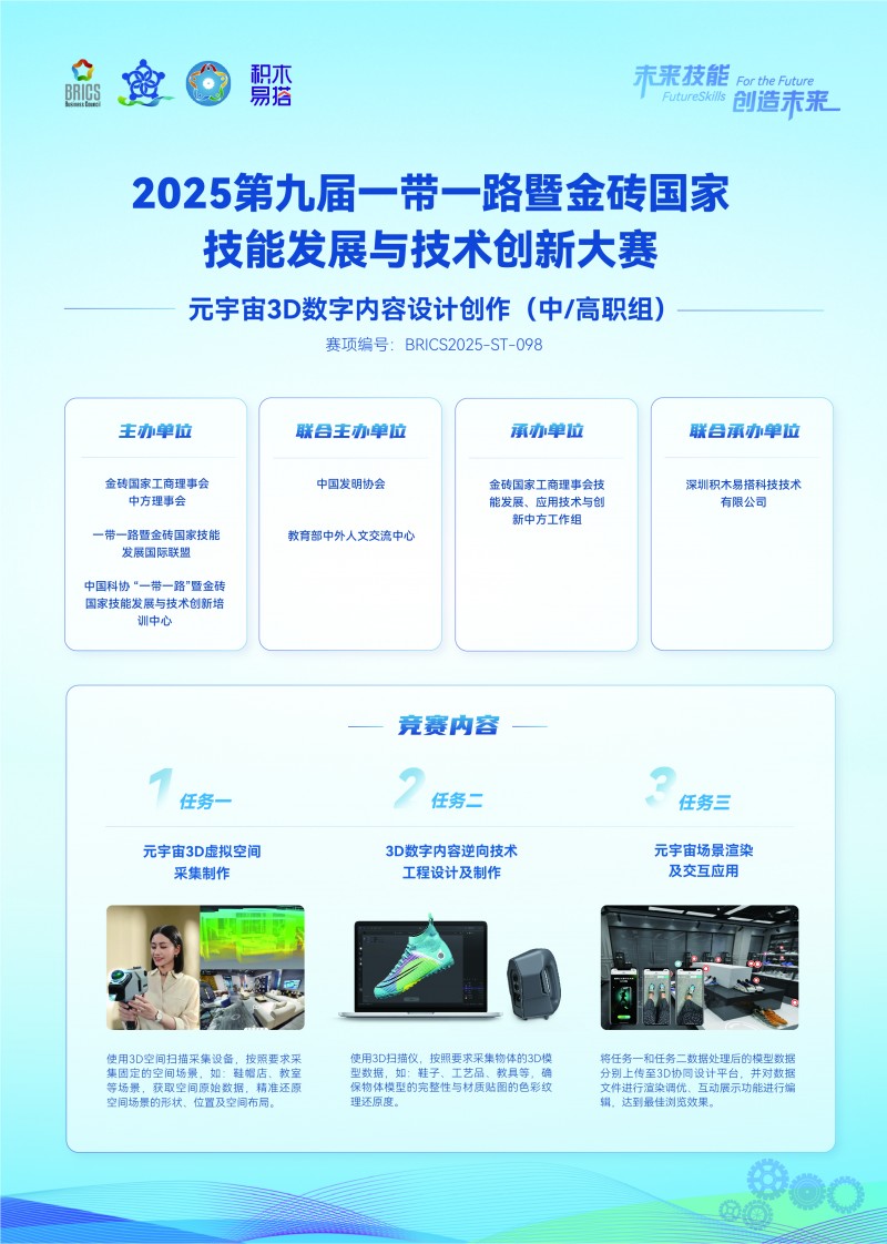 金砖大赛之元宇宙3D数字内容设计创作赛项由金砖国家工商理事会中方理事会、一带一路暨金砖国家技能发展国际联盟、中国科协“一带一路”暨金砖国家技能发展与技术创新培训中心主办,中国发明协会、教育部中外人文交流中心联合主办,金砖国家工商理事会技能发展、应用技术与创新中方工作组承办,深圳积木易搭科技技术有限公司(以下简称“积木易搭”)联合承办。
