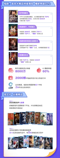 阅文CEO兼总裁侯晓楠表示:“2025年上半年,我们的在线阅读内容生态持续繁荣,在线业务收入同比增长2.3%至19.9亿元。IP运营业务方面,阅文IP在精品影视和动漫画领域持续展现出强劲实力,同时短剧和IP衍生品等新赛道也取得了突破性进展。短剧爆款率显著提升,IP衍生品业务的GMV更是达到了4.8亿元,接近去年全年水平,实现了跨越式发展。