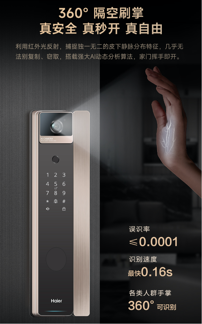 大家最常见的困扰就是忘记带钥匙了,这个时候,只需要在识别区前自然地伸出手掌,几乎是瞬间,门锁就“咔哒”一声开了。小孩不用踮脚,老人不用弯腰,科技感和便捷性拉满。它采用的是AI掌静脉识别技术,实测识别速度和准确度都非常高,暗光环境下表现依然稳定。