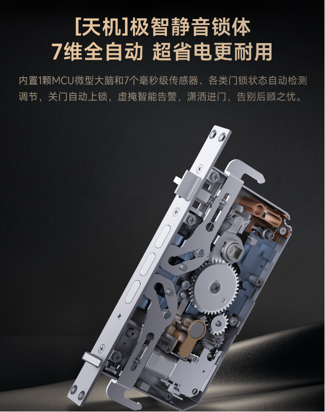 内置的7颗高精敏传感器确保了锁舌伸缩到位、门虚掩等状态精准监测,它拥有7.2N.m大电机,力量十足,开关门都很有信心,最重要的是还可以省电50%,续航更持久。