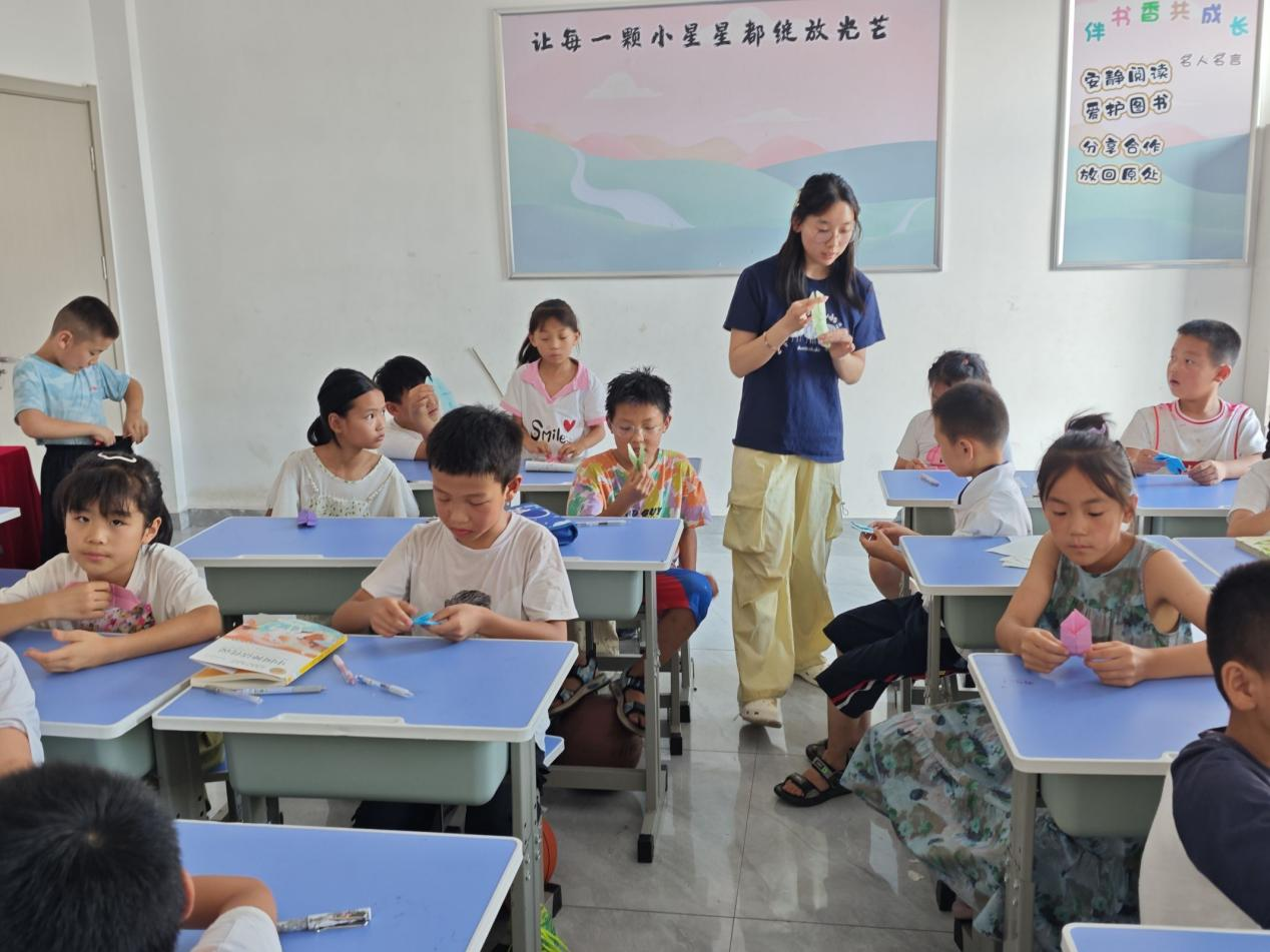 在折纸课上,实践队员提前准备了五颜六色的彩纸,耐心细致地教学生折信封、蝴蝶、手表等作品。实践队员一边示范折叠步骤,一边详细讲解各作品的折叠技巧,从纸张的对齐到边角的处理,每个细节都讲解得清晰明了。学生经过反复练习,一件件美观又富有创意的作品在他们手中诞生。美术课上,实践队员带领学生描绘身边的动物和植物,引导他们观察生物的形态与色彩。学生拿起画笔,将心中的热爱与想象融入其中,一幅幅作品彰显童真童趣与真挚情感。