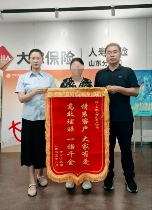 近日,客户于女士一家将印有“情系客户大家有爱,高效理赔一诺千金”的锦旗送到大家人寿山东分公司,再三感谢公司在家庭艰难时刻的暖心服务与高效理赔。