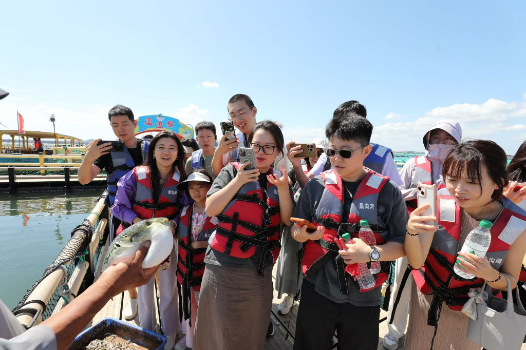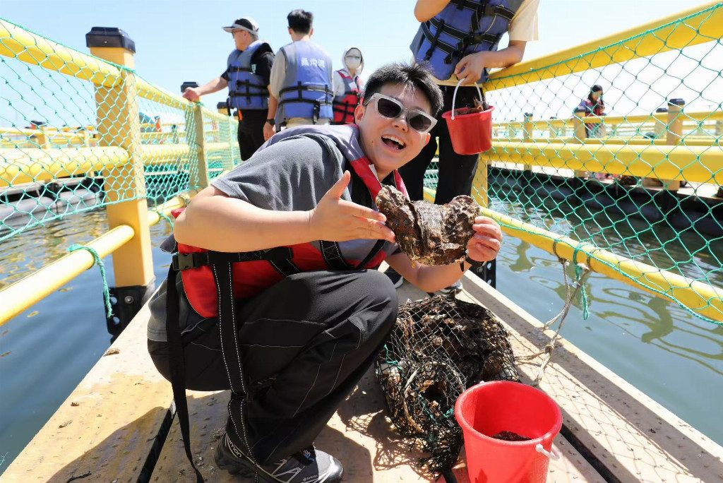在这里,采风团一行乘船出海观光、抛洒食物吸引海鸥环绕、参观原生态海鲜养殖区、体验逗鱼乐趣、亲手采摘贝类……一系列互动让大家沉浸式感受渔民日常,触摸海洋文化鲜活脉搏,直观感受“向海而生”的产业韧性。