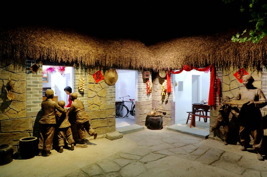 不远处,有一座胶东海草房模型,石墙草顶、古朴厚重,几尊渔民雕塑栩栩如生,让人仿佛真的见到了一户渔家正围坐笑语,岁月静好的渔家生活、与海相依的质朴情怀都在柔和的灯光里渐渐清晰。