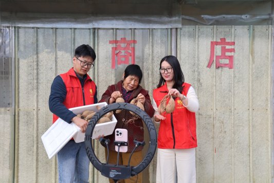 图为“金叶阳光”志愿服务队志愿者帮助零售户线上售卖地瓜