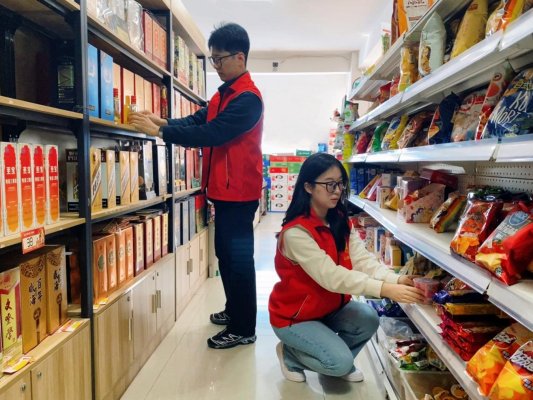 图为“金叶阳光”志愿服务队志愿者帮助零售户优化店铺布局
