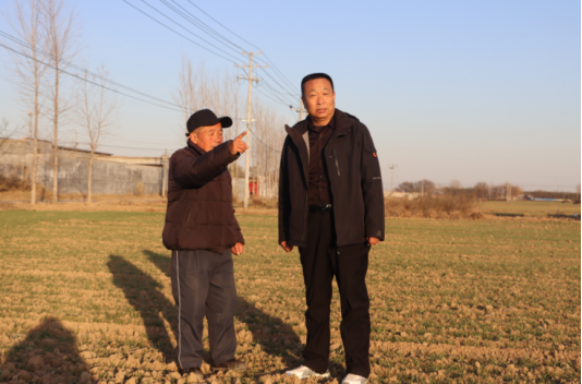 图为王振田和孙大哥站在承包的田地里,查看麦苗长势