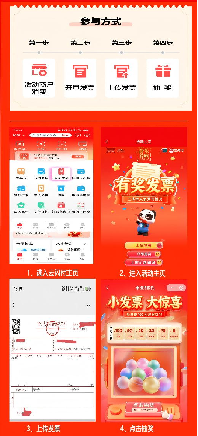 消费开票即可参与抽奖领取补贴,最低 8 元、最高 100 元,人人可参与、天天有机会,福利多多!