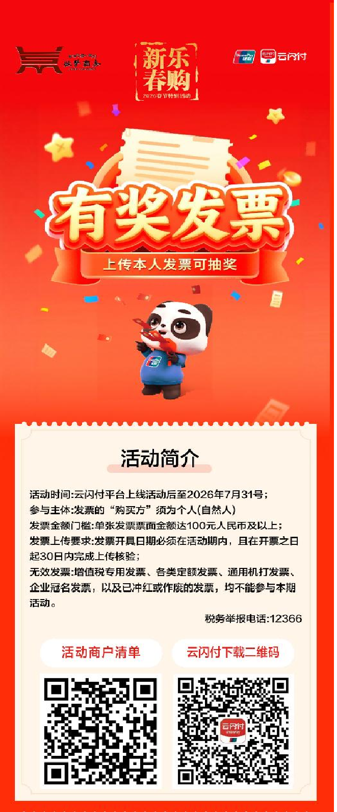 如今在拉萨市的餐馆、商场等消费场所,这句话成为一句热门提醒。活动主办方设计颇具巧思:它面向零售、餐饮、住宿等多个民生领域,以真金白银的奖金刺激消费意愿。主办方特别提醒:参与活动时,开具发票的商户需是云闪付内展示的活动商户;本次活动需消费满100元及以上,凭增值税普通发票参与,发票开具日期需在2026年2月2日至7月31日活动期间。