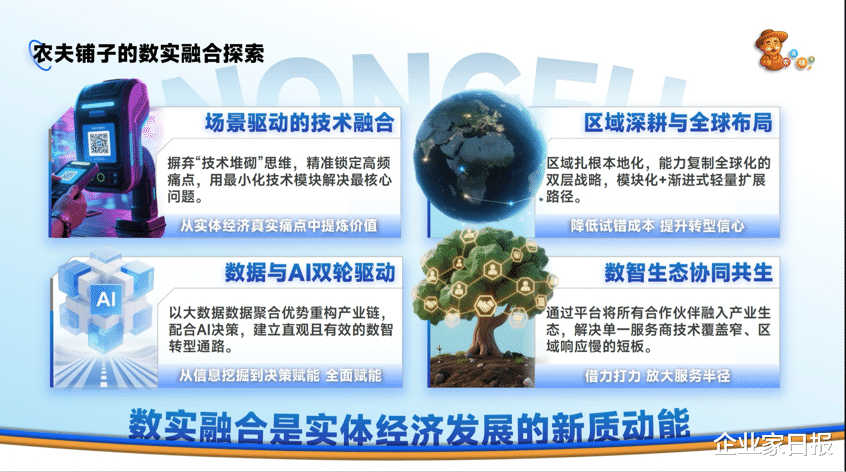 作为“中小微企业数智化转型升级服务商”,农夫铺子坚定“听党话、跟党走”的信念,锚定国家政策方向,深耕数实融合领域十余年,构建起涵盖数智化综合服务、数智云供应链、数智新零售、AI人工智能、智慧康养等九大核心业务板块的全链条服务体系,形成独具特色的“三维破局”策略与“政策契合-技术驱动-生态共生”数实融合发展模式。