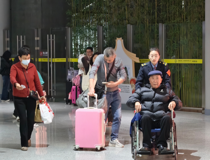 节后第八天,罗彩美在候车室看见一位听力不好的阿婆,推着行李车在检票口来回徘徊。阿婆第一次坐高铁去广州,既不识字也不会讲普通话,不懂怎么坐车急得团团转。