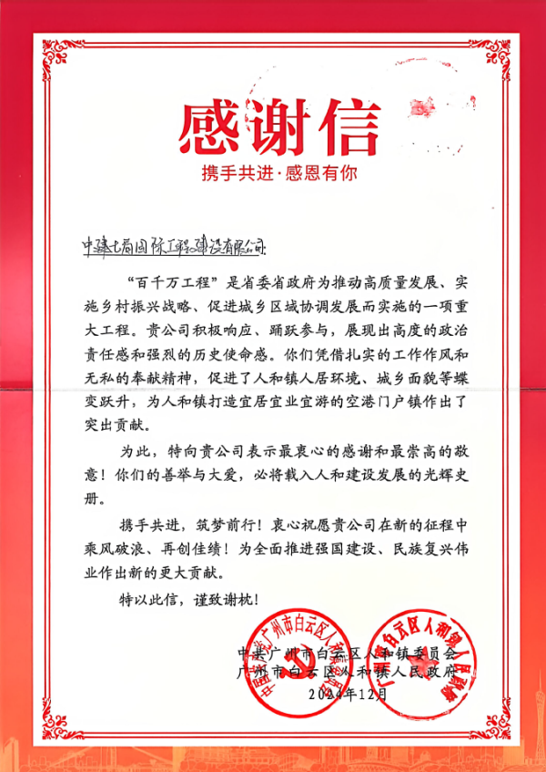 近日,广州市白云区人和镇人民政府向中建七局国际公司白云区百千万工程项目经理部发来感谢信,并赠予奖杯及“齐心协力显担当,携手奋进百千万”锦旗,充分肯定项目经理部团队在推进“百千万工程”中的卓越能力、优质履约水平和央企责任担当。感谢信指出,“百千万工程”是广东省委、省政府推动高质量发展、实施乡村振兴、促进城乡协调的重大举措。国际公司积极响应、踊跃参与,体现了高度的政治责任感与强烈的历史使命感。