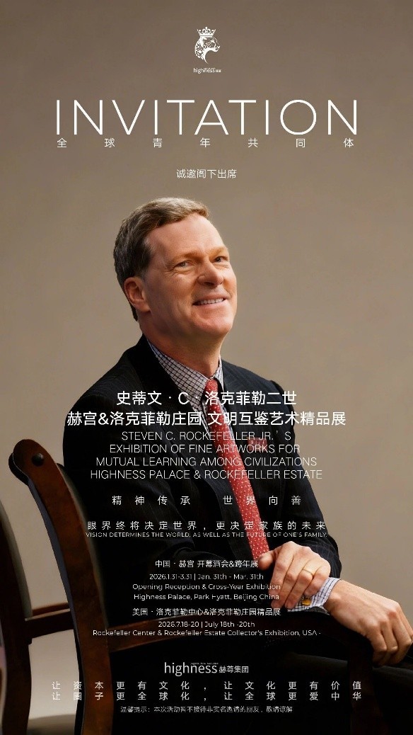 北京讯 —— 新年伊始,赫尊集团立足全球视野,正式擘画新一年发展蓝图。依托在文化艺术、国际投资领域的深厚积淀,以专业实力践行 “文化赋能、资本护航、家族传承” 的核心使命,在国际投资、艺文合作及家族传承赛道上稳步前行。开年首展,赫尊集团邀约大家共赴一场跨越国界的美学对话,以洛克菲勒空中艺术展奏响东西文化和鸣乐章,也为2026 年文化艺术布局拉开璀璨序幕。据悉,在【文明互鉴 美学对话】的灯塔在中国赫宫点亮之际,赫宫更将在未来10年,在全球范围持续一场跨文化的顶级艺术交流,下一站已确定为洛克菲勒中心与洛克菲勒庄园,届时,史蒂文・C・洛克菲勒将在庄园迎接大家,并带领中国艺术家和藏家参观洛克菲勒家族的珍贵收藏;第三站为中东,赫宫将请出中东皇室,鉴藏中国艺术家作品;之后更有温莎城堡、蓬皮杜中心、古根汉姆美术馆,以及联合国双总部展期,敬请期待。