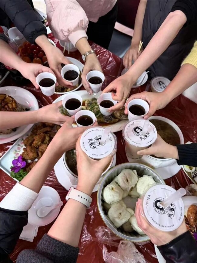 没有圆桌酒席,而是一场简单的餐叙——几道家常小菜,大家端着盘子随意落座,有人站着跟同事咬耳朵,有人给身边的姐妹夹一块点心。食物或许简单,但这份“不用应酬、只管享用”的自在,却是最好的调味料。