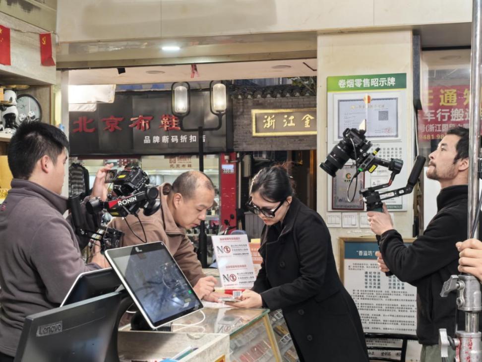 图为:杭州市烟草专卖局工作人员拍摄短视频花絮