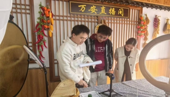 在又新镇万安村,团队实地走访了万禾源农业专业合作社及农产品直播间。该村地处深丘地带,曾长期受困于灌溉、土地、劳动力等“老大难”问题。近年来,村党委书记带领村“两委”成员自筹资金成立合作社,探索“支部+合作社+农户”模式,推动集体经济逐步壮大,村民收入稳步提升。团队成员详细询问了合作社运营机制、直播销售情况与存在困难,了解其如何在资源有限条件下实现从无到有的跨越。