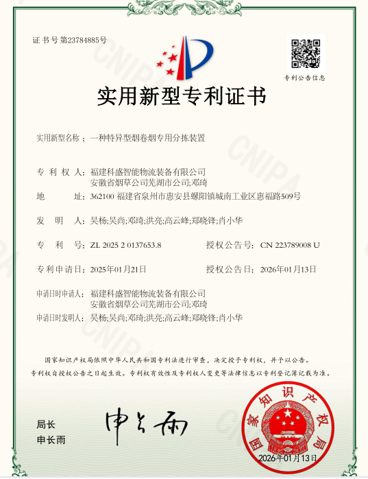 图为《一种特异型烟卷烟专用分拣装置》实用新型专利证书