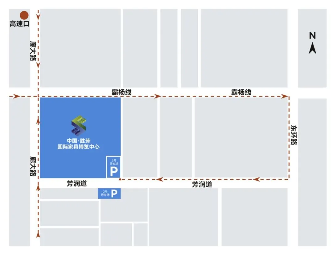 自驾导航请搜索「胜芳国际家具博览中心」,车辆可停泊在2号停车场、3号停车场。(温馨提示:4月7日-10日,芳润道博览中心路段实施交通管控,禁止任何机动车、非机动车通行。)