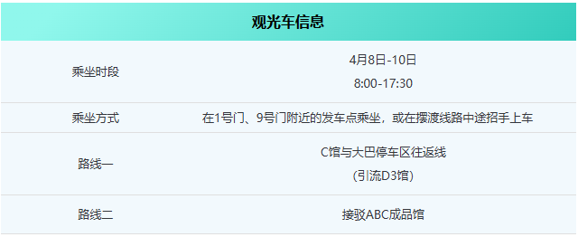 展会期间,博览中心将提供免费观光车摆渡服务,方便采购商来往于各个展区之间,省时省力更省心。