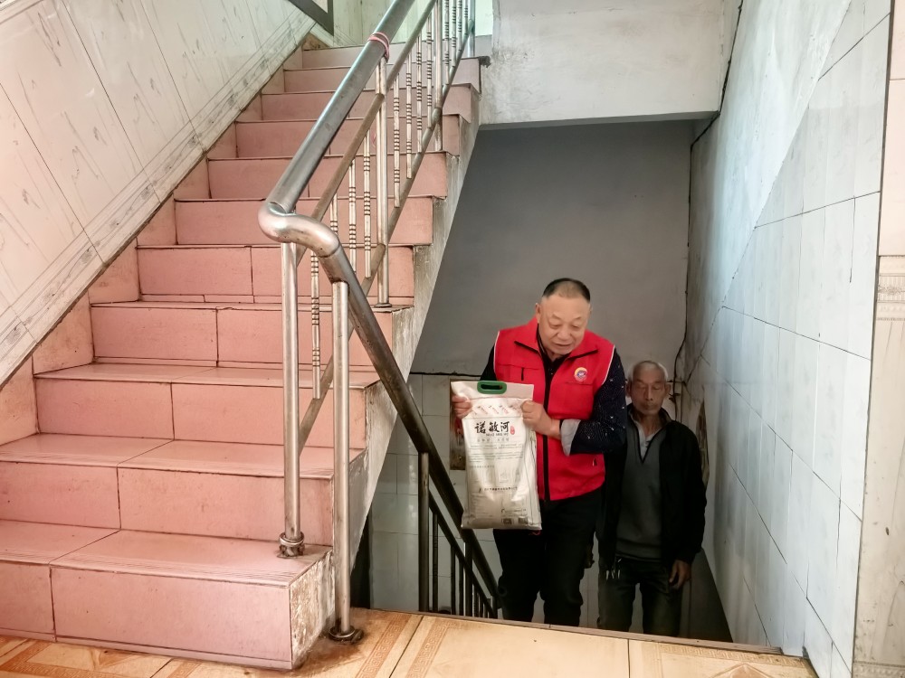 (图为老余为行动不便的邻居送米上楼,用热心温暖邻里)