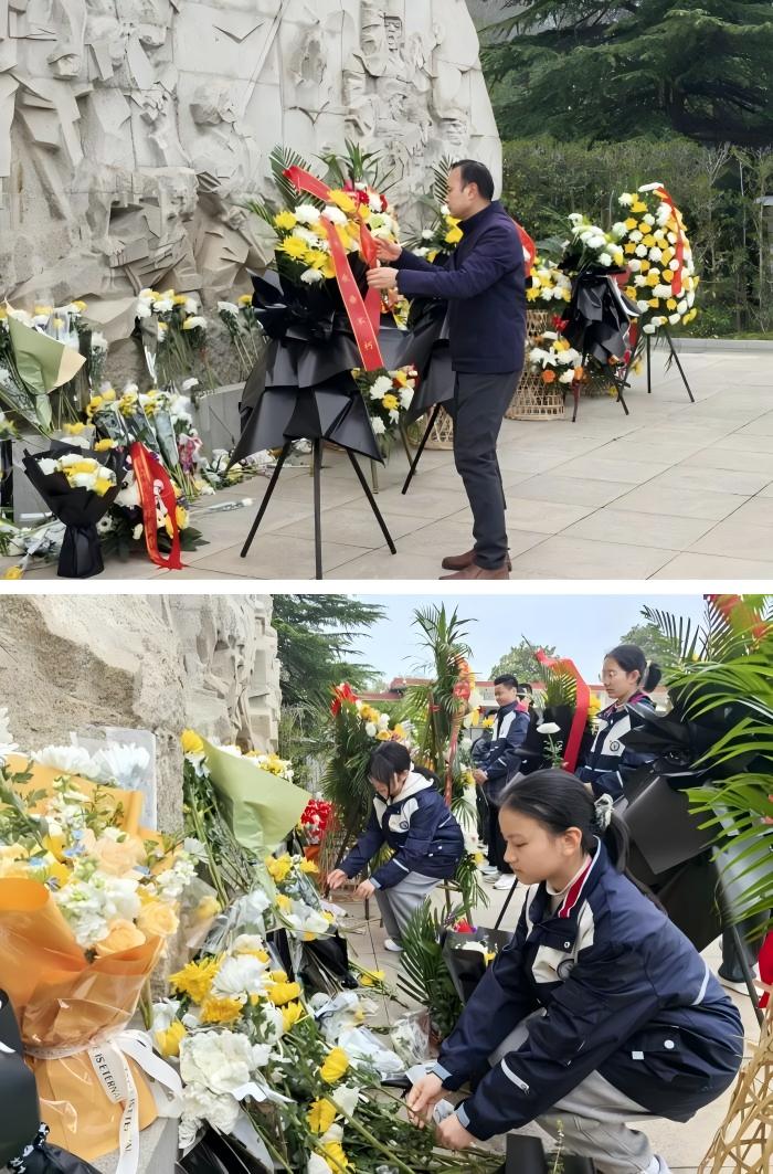 默哀礼毕,进入敬献花篮与鲜花环节。合肥一六八玫瑰园学校南校党支部副书记方国玉缓步走向烈士墓,郑重敬献花篮并仔细整理绶带,每一个动作都饱含对先烈的崇高敬意。随后,党员、团员、少先队员代表依次上前,将手中鲜花轻放于墓前。朵朵鲜花寄托着师生们的无限哀思,也凝聚着新时代党团队员传承英烈精神、勇担时代使命的坚定信念。