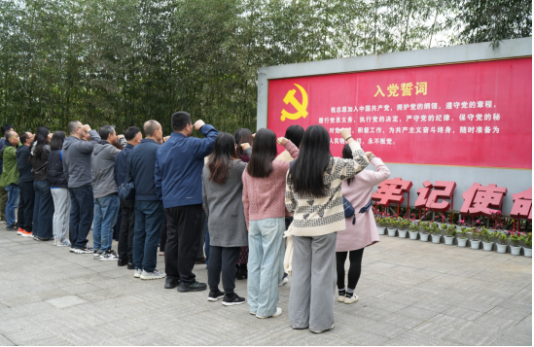 随后,全体党员怀着无比崇敬的心情来到成都战役烈士陵园纪念碑广场,在纪念碑两侧庄严肃立。党员代表缓步走向纪念碑,敬献花篮并仔细整理缎带。朵朵鲜花寄托着无限哀思,深深鞠躬表达着坚定决心。全体党员高举右拳,重温入党誓词,铿锵有力的誓言在广场上空回荡,既是对初心的叩问,更是对使命的承诺。