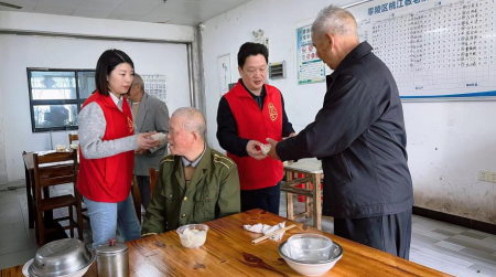 (志愿者为老人端上暖心饺子)