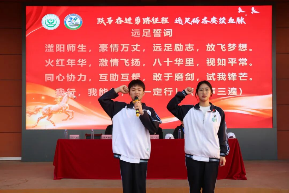 清晨的操场,班旗猎猎,少年们的眼睛里闪着光。出征大会上,全体学子高举右拳,誓言震天:“滏阳师生,豪情万丈。远足励志,放飞梦想。火红年华,激情飞扬。八十华里,势如平常。同心协力,互助互帮。敢于磨剑,试我锋芒。我行,我能行,一定行!”