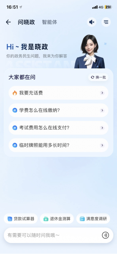 据悉“晓政”的服务已覆盖16000种政务事项,实现“人找服务”向“服务找人”的转变,广泛应用于公积金、人社、公安、不动产等多个领域。助力70多个部委、省级机构建设智能体,其中多个案例入选《政务智能体发展报告(2025)年》,实现从“货架式找服务” 到“对话办”升级,让越来越多人真正享受到“一句话办事”的全新服务体验。通过这些实践,提供三大创新能力:一是智能问答,面向政务场景的AI问答服务,能帮助用户理解复杂政策,获取办事指南和服务攻略。二是辅助办理,基于MCP、Skills等技术,围绕公积金提取、育儿补贴申领、充值缴费等高频事项,推出“边问边办”“AI辅助填表”“智能导办”等服务模式。三是智能应用,围绕群众关注度高、使用频次高的民生场景,提供AI养老金测算、贷款试算、补助补贴查询等能力。