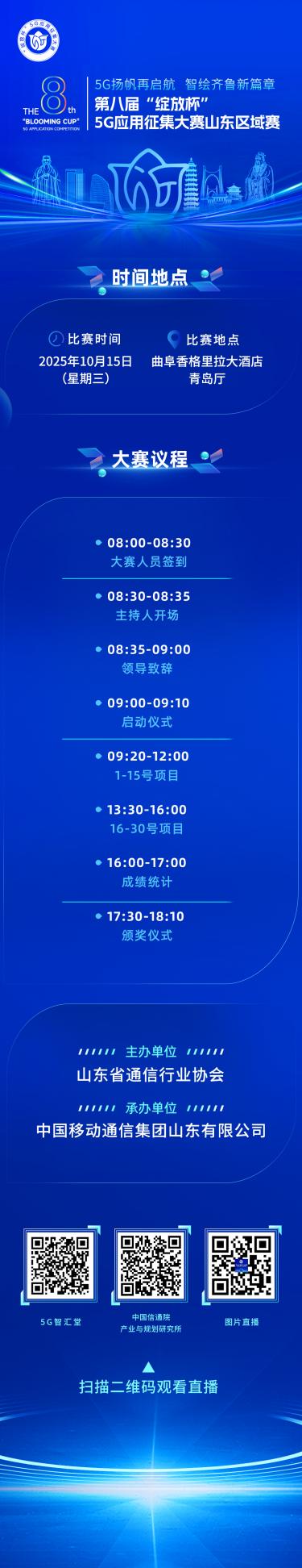 由山东省通信行业协会主办,中国移动通信集团山东有限公司承办的第八届绽放杯5G应用征集大赛山东区域赛将于2025年10月15日在济宁市开展决赛