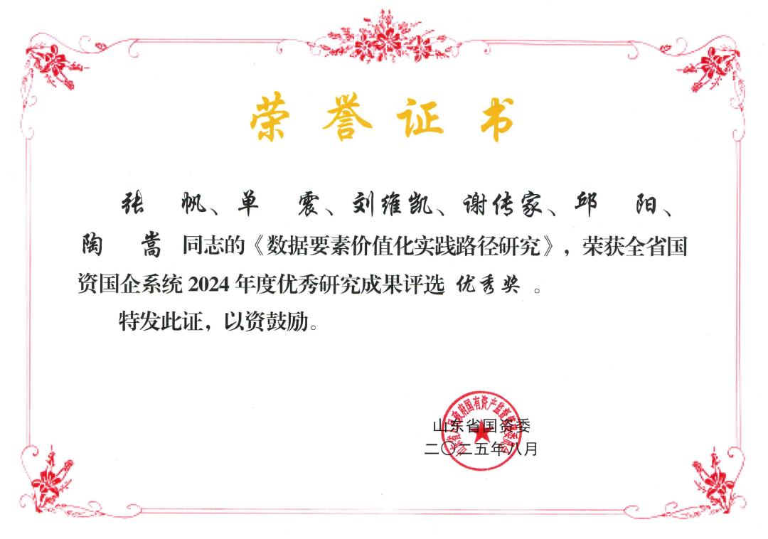 近日,山东省国资国企系统2024年度优秀研究成果评选结果正式公布,浪潮卓数大数据提报的《数据要素价值化实践路径研究》荣获优秀奖。该研究