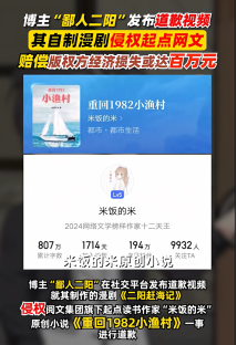 近日,自媒体博主“鄙人二阳”通过抖音等平台发布道歉视频,就其制作的漫剧《二阳赶海记》侵权阅文集团旗下起点读书作家“米饭的米”原创小说《重回1982小渔村》一事进行道歉。资料显示,《重回1982小渔村》