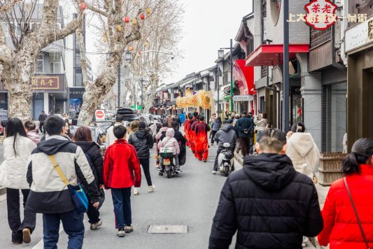 2月23日,农历正月初一至初七,浙江省绍兴市越城区上大路“茶饮一条街”张灯结彩,“喜迎新春 马上有礼”系列年俗活动在此举行。活动