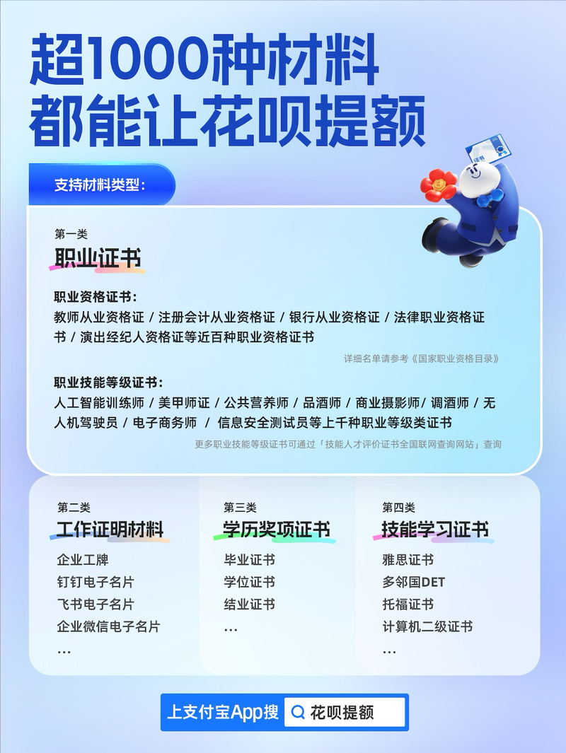 花呗首创“证书提额”新模式 1000种职业证书可用于花呗提额