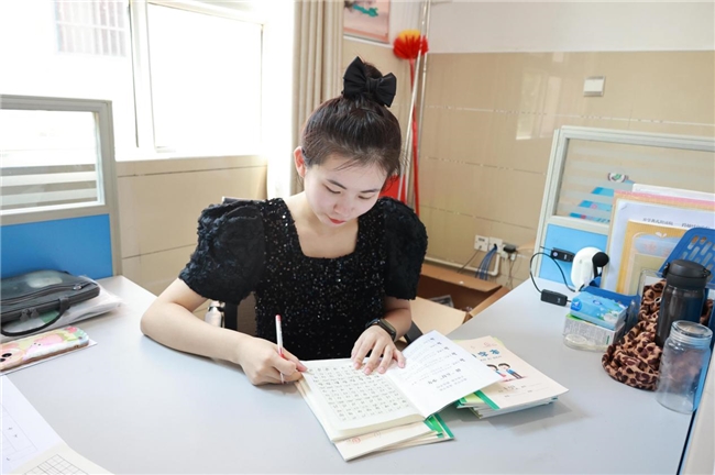 曾有男孩因长期遭受家庭暴力,存在自残行为且对同学充满攻击性;还有女生受读写障碍困扰,作业本上歪扭的字迹藏着暴躁与自卑。丁老看在眼里、急在心里,采用“手把手教学+家庭沟通”模式,一次次家访了解孩子家庭环境,与家长密切沟通。课堂上,她从不批评,而是不断鼓励:“你看,这一次比刚才有进步啦!”用温暖与关切传递爱,渐渐驱散孩子眼中的阴霾,让他们重拾灿烂笑容。