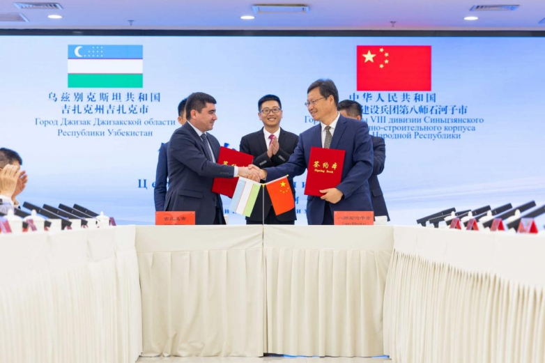 揭牌仪式后,“八师石河子市与乌兹别克斯坦吉扎克市产业友好城市”签约仪式在石河子市市民中心会场举行,石河子开发区领导与外方嘉宾代表双方签约,石河子开发区、阿拉丁控股集团领导见证签约。