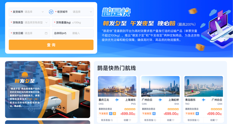 在国家持续推进物流强国战略与“互联网+物流”深度融合的背景下,喜鹊到依托上海均瑶集团的资源与技术优势,打造出真正实现“运力在线化、服务商品化”的一站式空运平台。用户可通过系统一键查询全国超过5000条航线、1.5万个日均航班资源,实时比价并下单,以往繁琐的货运流程被压缩为几分钟的简单操作。