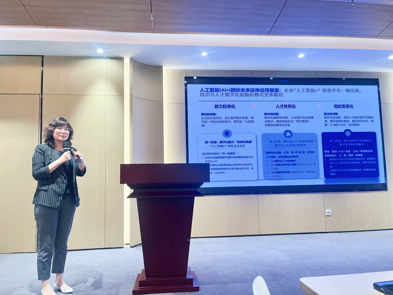 在专题研讨环节,中智咨询合伙人兼人才事业部负责人孙雪飞详细介绍了《企业人工智能(AI+)管理人员能力要求》团体标准的制定背景、意义与核心内容。